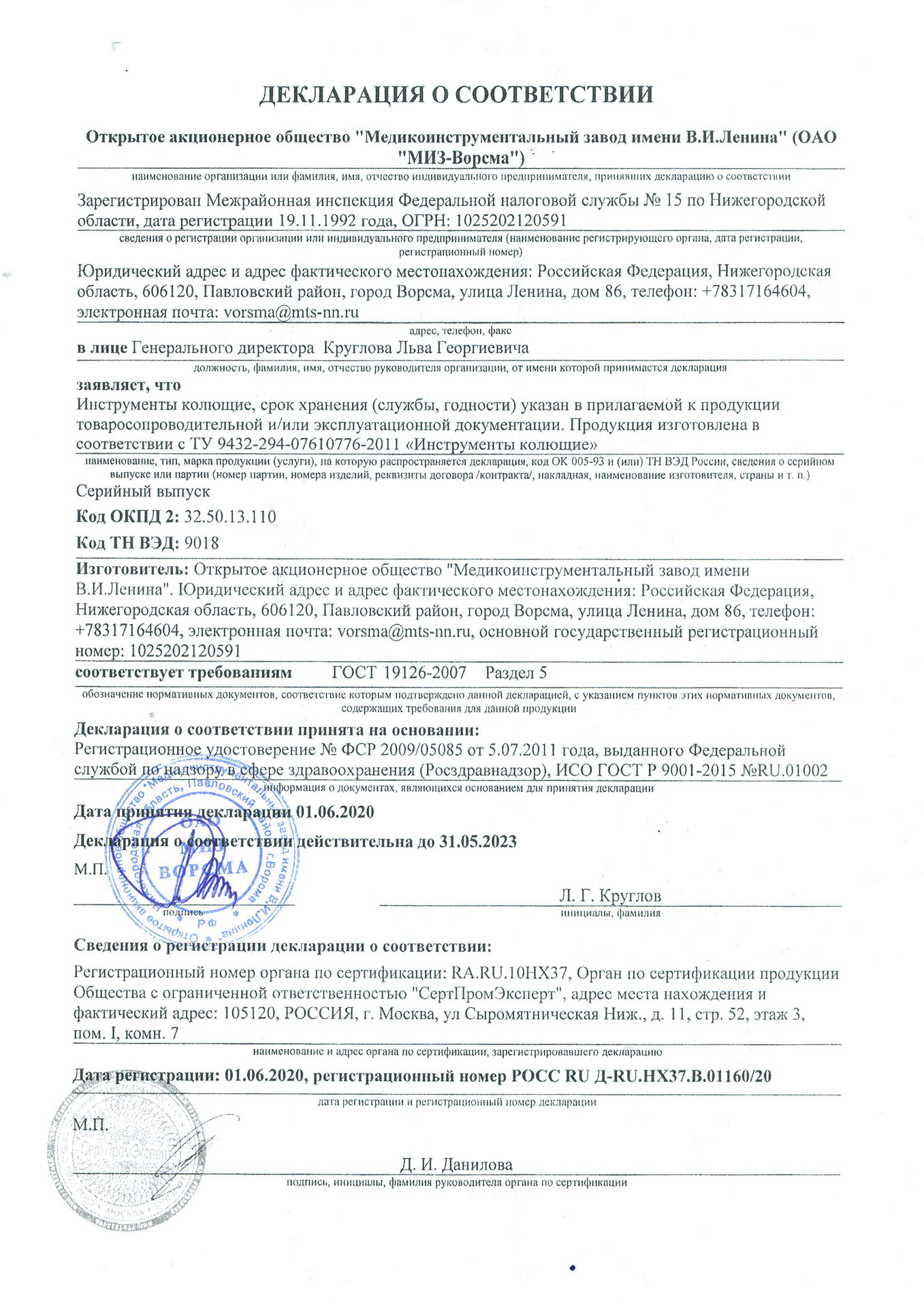 Декларация о соответствии № РОСС RU.АГ58.Д02494 от 28.04.2017г.