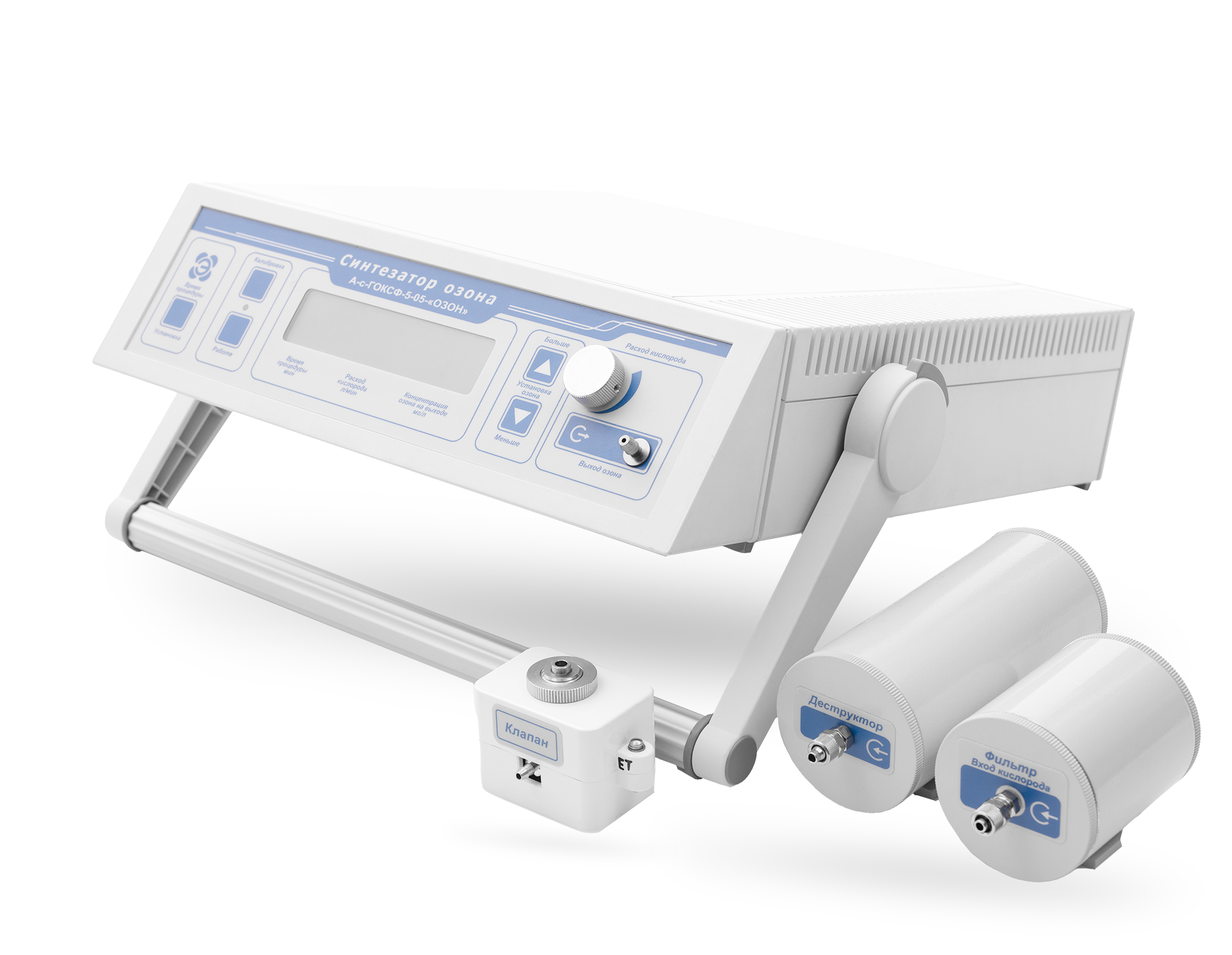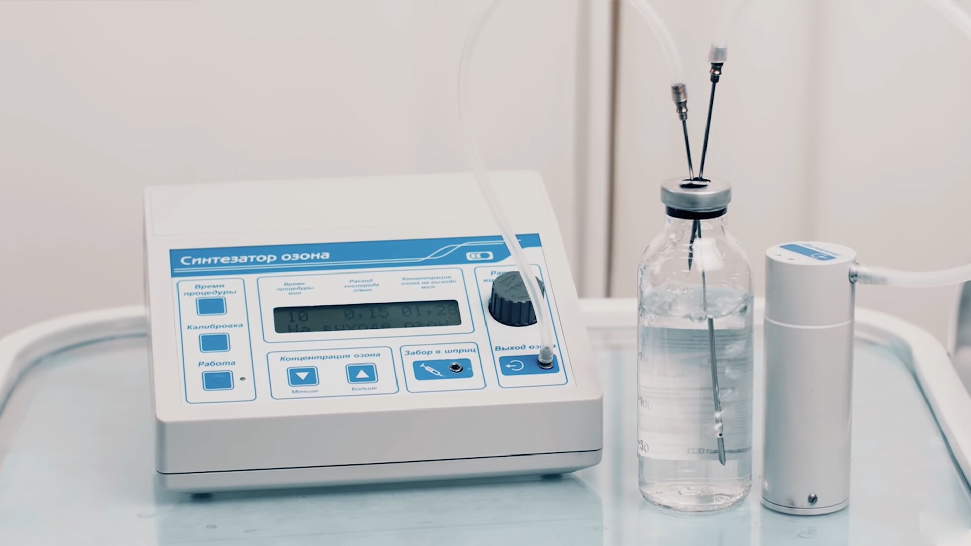 Встроена разрядная камера с двойным барьером для получения озона, что обеспечивает чистоту озонокислородной смеси, отвечающую медицинским требованиям.